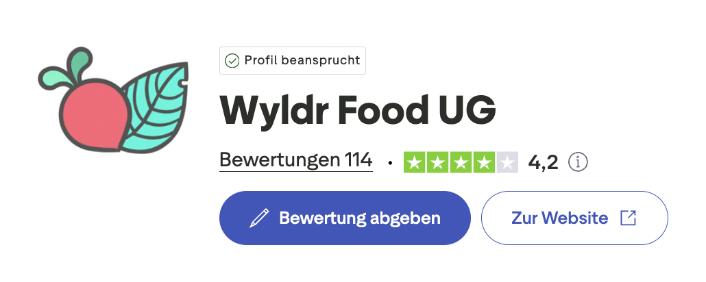 Bei Trustpilot wird die wyldr Bio-Kochbox insgesamt die Note GUT gegeben, bei einer Benotung von 4,2/5 und 114 abgegebenen Bewertungen. (Stand: August 2025)